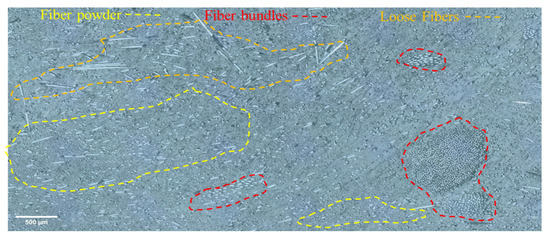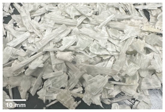 Part of the fiber bundles obtained from the recycled EPGs were still impregnated with a thermoset matrix, as seen in Figure 2. Mechanically recycled glass fiber-reinforced thermoset composite scraps were generally not homogeneous; EPGs were obtained in the form of powder, fiber bundles impregnated by resin, or residual thermoset matrix flakes.