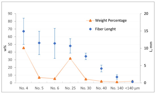The results for the length ranges and weight distribution analysis of the EPG bundle fractions obtained by recycling are presented in Figure 4. The particle size analysis of recycled EPGs revealed that 89.74% were larger than 6 mm, 8.13% were between 1–6 mm, and 2.13% were smaller than 1 mm. The measurements over a wide range showed that the average fiber length was about 8 mm. The fact that EPG fiber lengths span a wide spectrum from <0.1 mm to 21 mm creates complexity in characterizing fiber lengths.