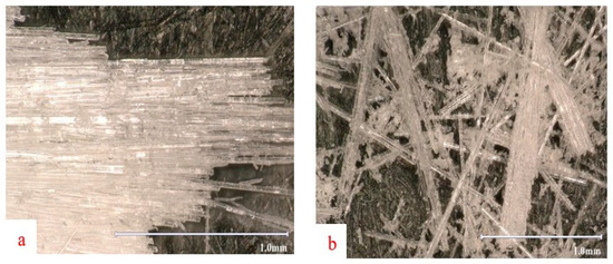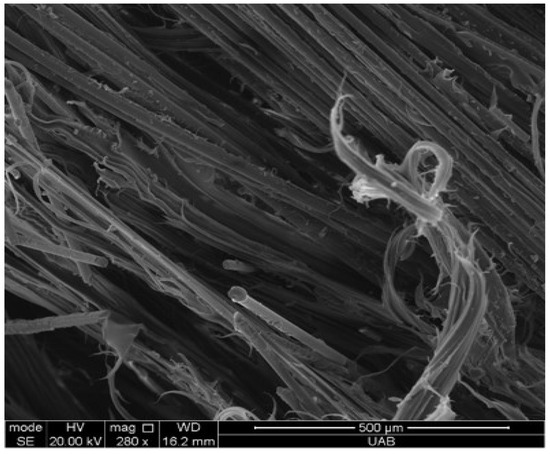 The matrix material remaining on the fiber surfaces is likely to reduce the effectiveness of the surface treatment applications to the underlying fiber bundles and have a poor load transfer ability. The fiber attritions and fragmentation during crushing also have negative effects on the strength of the composite. Recycled fiber bundles with low matrix residue are important for the interfacial bonding between the matrix and the fiber to be effectively established for new composite products. The surface condition of the EPG bundles obtained by recycling is shown in Figure 5a,b.