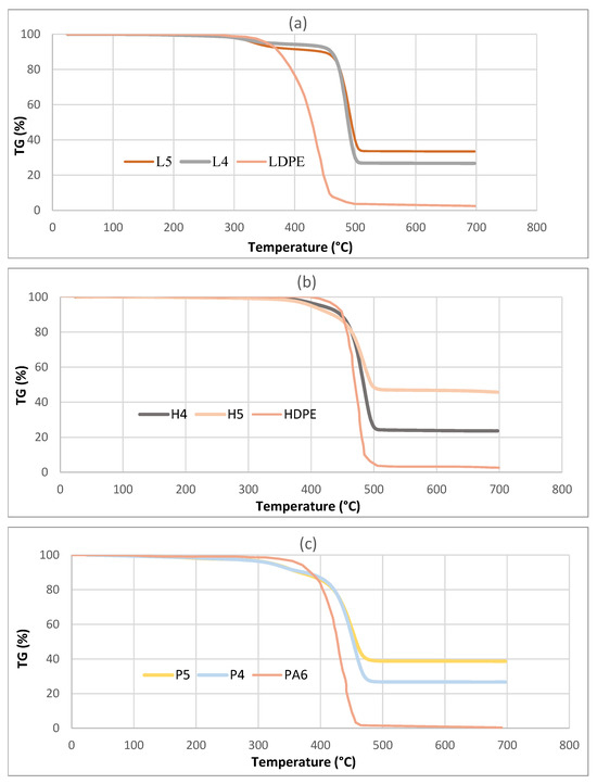 TGA curves of STCs in a nitrogen atmosphere. (a) LDPE samples, (b) HDPE samples, and (c) PA6 samples.