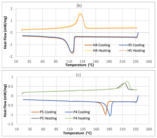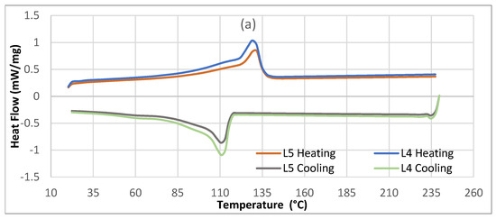 The crystallization and melting behaviors of the STCs prepared according to different filler ratios of EPG thermoset scraps were investigated using DSC. Representative DSC thermograms of STC materials (L4, L5, H4, H5, P4, and P5) prepared with 40% and 50% EPG scrap thermoset materials are shown in Figure 9a–c.