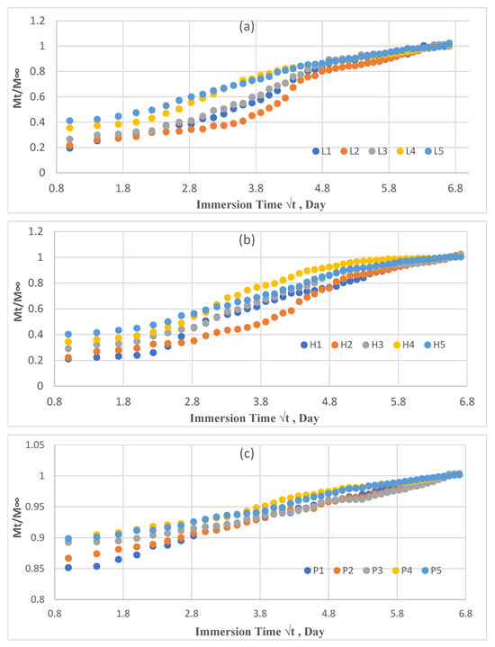 Water absorption results. (a) LDPE–thermoset scraps, (b) HDPE–thermoset scraps, and (c) PA6–thermoset scraps.