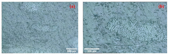 - Microstructural examinations (optical microscopy and SEM) revealed that at high filler loadings, EPG fiber bundles were not uniformly dispersed, leading to microvoids and localized stress concentrations that limited the mechanical performance. Partial wetting of the fibers by the residual thermoset phase and the thermoplastic matrix weakened interfacial bonding, thereby reducing load transfer efficiency. In particular, filler contents above 30% resulted in more pronounced heterogeneity and microstructural defects, which were directly associated with strength reductions.