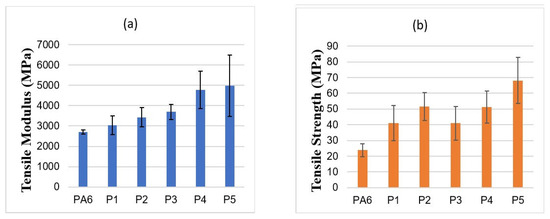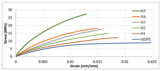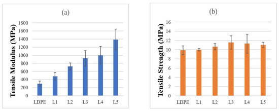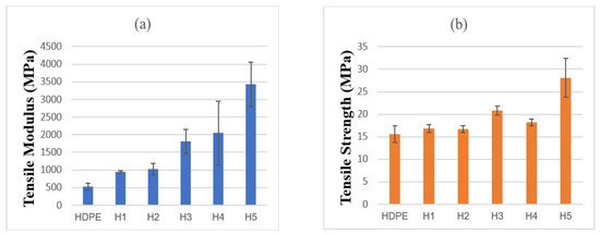 - Tensile results showed clear reinforcement effects across all matrices. In HDPE, the modulus increased from 523 MPa (neat) to 3424 MPa at 50 wt% (~6-fold), with strength peaking at +23.6% before declining at higher loadings. PA6 composites exhibited the highest stiffness, increasing from 3035 to ~5000 MPa, while tensile strength improved by ~25% at optimal filler levels. LDPE composites showed balanced improvements at 10–20 wt%, with modulus gains up to ~590% and strength increases of ~40–47%, though excessive loading reduced strength. Overall, moderate filler contents offered the best trade-off between stiffness and strength.