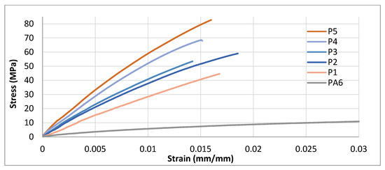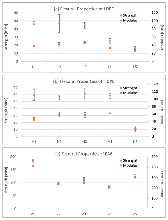 - Flexural tests confirmed significant stiffening with filler addition across all matrices. In LDPE composites, the flexural modulus increased by 286–589%, accompanied by ~40–47% improvement in flexural strength. HDPE composites showed a ~347% rise in the modulus and up to a 23.6% strength enhancement. PA6-based composites exhibited the highest rigidity, with flexural modulus gains exceeding 50% and strength improvements of ~25% at optimal filler loadings. However, at high filler levels (≥40 wt%), heterogeneity and fiber agglomeration led to limited reductions in strength.