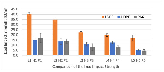 - Izod impact tests showed contrasting trends depending on the matrix. LDPE composites exhibited improved toughness at low filler levels, with impact energy increasing by ~12–18% up to 20 wt%, before declining at higher loadings. HDPE composites, in contrast, showed a continuous decrease, with impact strength reductions of ~15–25% across the filler range. PA6-based composites experienced the most pronounced loss, with impact strength decreasing by ~30–40% at 50 wt% loading, reflecting the matrix’s higher polarity and brittleness. Overall, moderate filler contents in LDPE offered a balance between stiffness gains and acceptable toughness, whereas HDPE and especially PA6 were more sensitive to impact degradation.