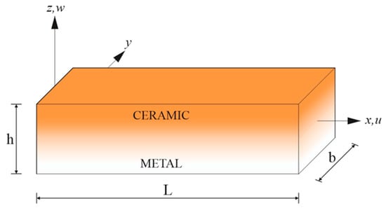 Here, h is the beam height and p is a positive parameter known as the power–law index, ranging 0 ≤ p ≤ ∞. When p = 0, the material is entirely ceramic. Using this relationship, the Young’s modulus and mass density are determined by the following expressions: