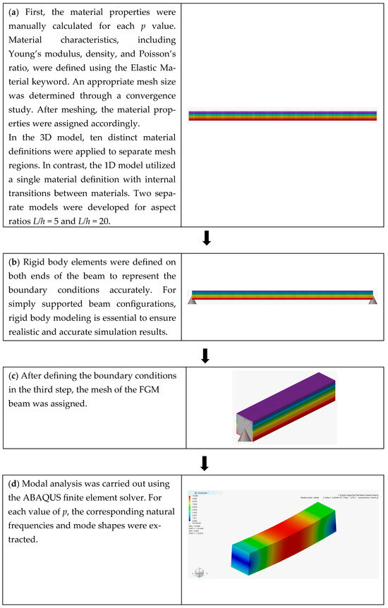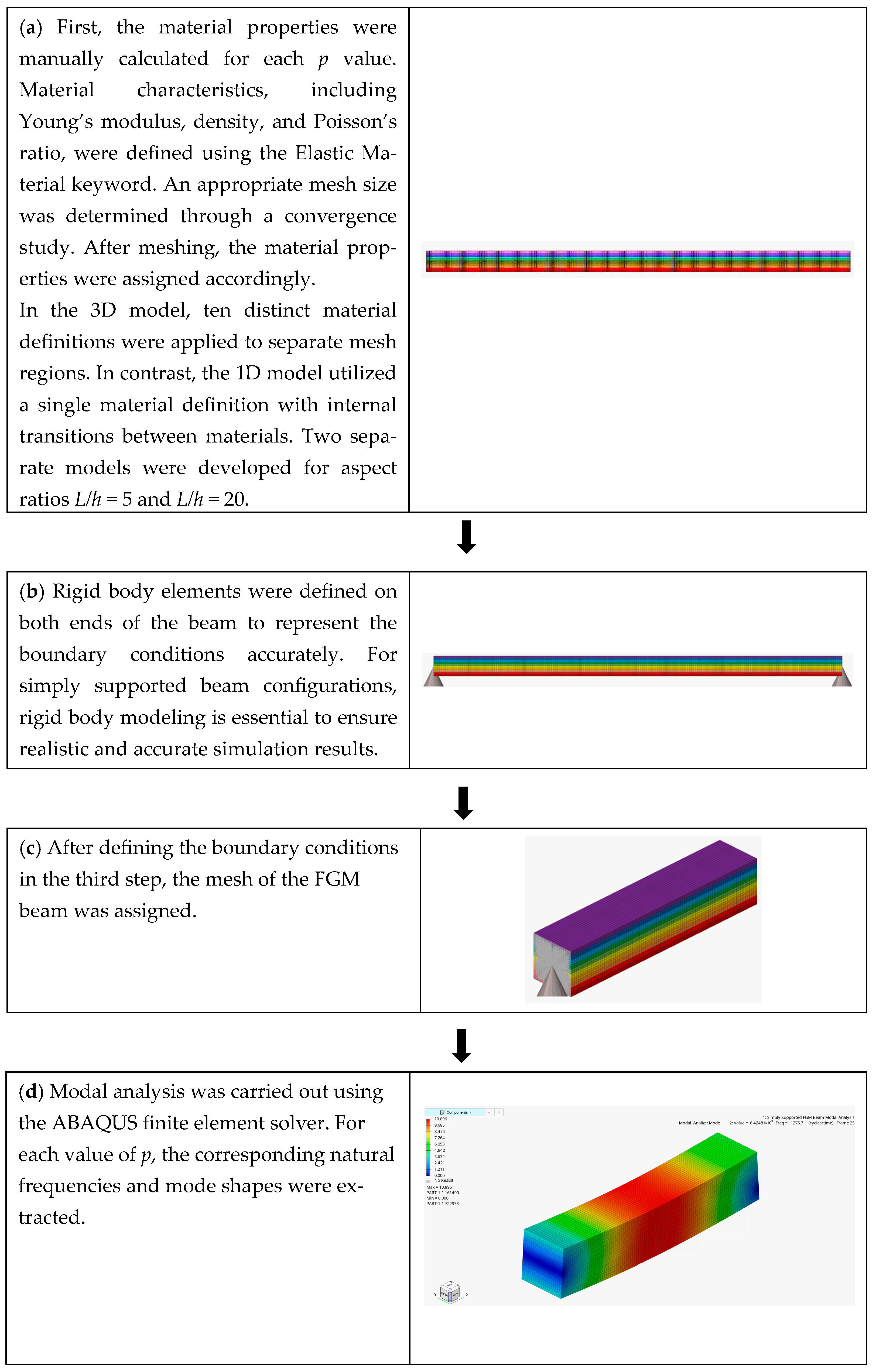 Two different modeling strategies were carried out in ABAQUS alongside the analytical approach. A HEX20 solid element model was built where the material gradation was defined layer by layer, while a B32 Timoshenko beam element was used to develop a beam-type 1D model. The free vibration frequencies were calculated for the first three modes under simply supported boundary conditions, considering two slenderness ratios (L/h = 5 and L/h = 20) and a range of power–law index (p) values. Results were also obtained for p = 50, which have not been reported in the literature so far. To the best of our knowledge, no other study has modeled both solid and 1D elements in ABAQUS and compared them systematically with each other, as well as with the analytical solution, which highlights the originality of this work.