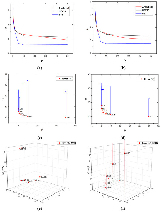 (a) Comparison of dimensionless frequencies values obtained from analytical and numerical solutions for the L/h = 5 (m = 1). (b) Comparison of dimensionless frequencies values obtained from analytical and numerical solutions for the L/h = 20 (m = 1). (c) Percentage error of the dimensionless frequency obtained from the numerical results (B32) compared to the analytical reference results (L/h = 5, m = 2). (d) Percentage error of the dimensionless frequency obtained from the numerical results (HEX20) compared to the analytical reference results (L/h = 5, m = 2). (e) Three-dimensional percentage error of the dimensionless frequency obtained from the numerical results (B32) compared to the analytical reference results (L/h = 20, m = 3). (f) Three-dimensional percentage error of the dimensionless frequency obtained from the numerical results (HEX20) compared to the analytical reference results (L/h = 20, m = 3).