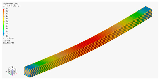 As can be seen from Table 2, Table 3 and Table 4 and Figure 3, the results for all three modes indicate that the HEX20 solid element model shows consistent agreement with the analytical solutions. In contrast, the frequencies obtained from the B32 Timoshenko beam element exhibit slightly larger deviations from the analytical results compared to the HEX20 model, especially beyond a certain p value. This behavior is thought to stem from how the 1D element represents gradation transition, which introduces irregularities in the results. In addition, Figure 5, Figure 6, Figure 7, Figure 8, Figure 9 and Figure 10 present the frequencies obtained for both the HEX20 solid element and the B32 beam element, corresponding to the first three modes at a selected value of p. Overall, the authors believe that the outcomes of this study can serve as a practical reference for the computational analysis of FGM structures, and offer guidance for future research in the field.