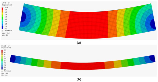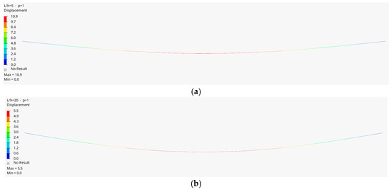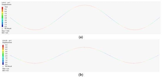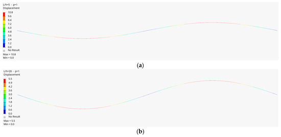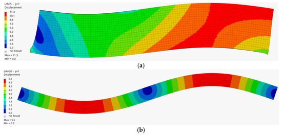 The first mode of the FG beam (a) for the length-to-height ratio (L/h = 5) and p = 1, and (b) for (L/h = 20) and p = 1 (HEX20).