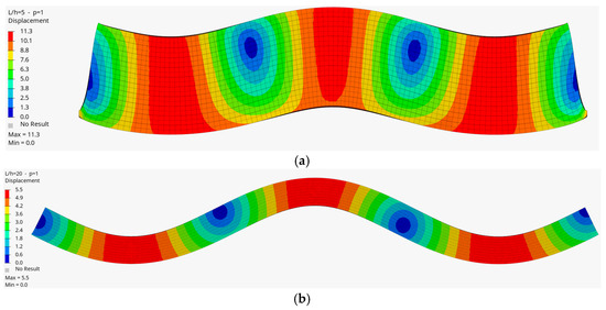 The third mode of the FG beam (a) for the length-to-height ratio (L/h = 5) and p = 1, and (b) for (L/h = 20) and p = 1 (HEX20).