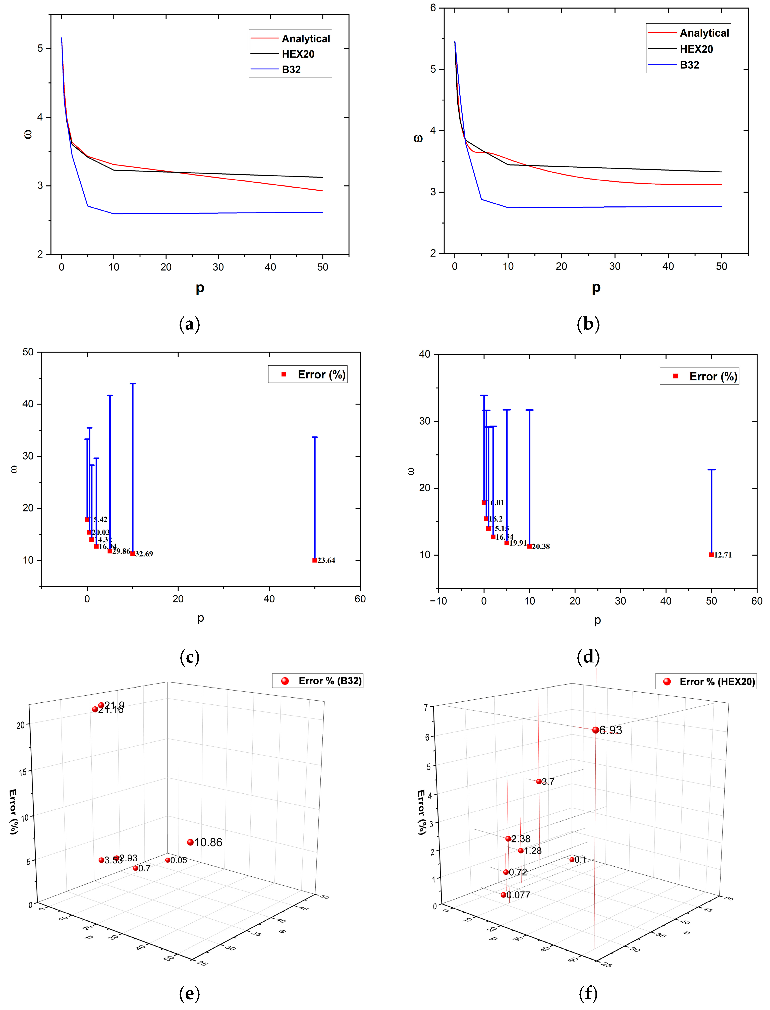 Figure 3. (a) Comparison of dimensionless frequencies values obtained from analytical and numerical solutions for the L/h = 5 (m = 1). (b) Comparison of dimensionless frequencies values obtained from analytical and numerical solutions for the L/h = 20 (m = 1). (c) Percentage error of the dimensionless frequency obtained from the numerical results (B32) compared to the analytical reference results (L/h = 5, m = 2). (d) Percentage error of the dimensionless frequency obtained from the numerical results (HEX20) compared to the analytical reference results (L/h = 5, m = 2). (e) Three-dimensional percentage error of the dimensionless frequency obtained from the numerical results (B32) compared to the analytical reference results (L/h = 20, m = 3). (f) Three-dimensional percentage error of the dimensionless frequency obtained from the numerical results (HEX20) compared to the analytical reference results (L/h = 20, m = 3).
