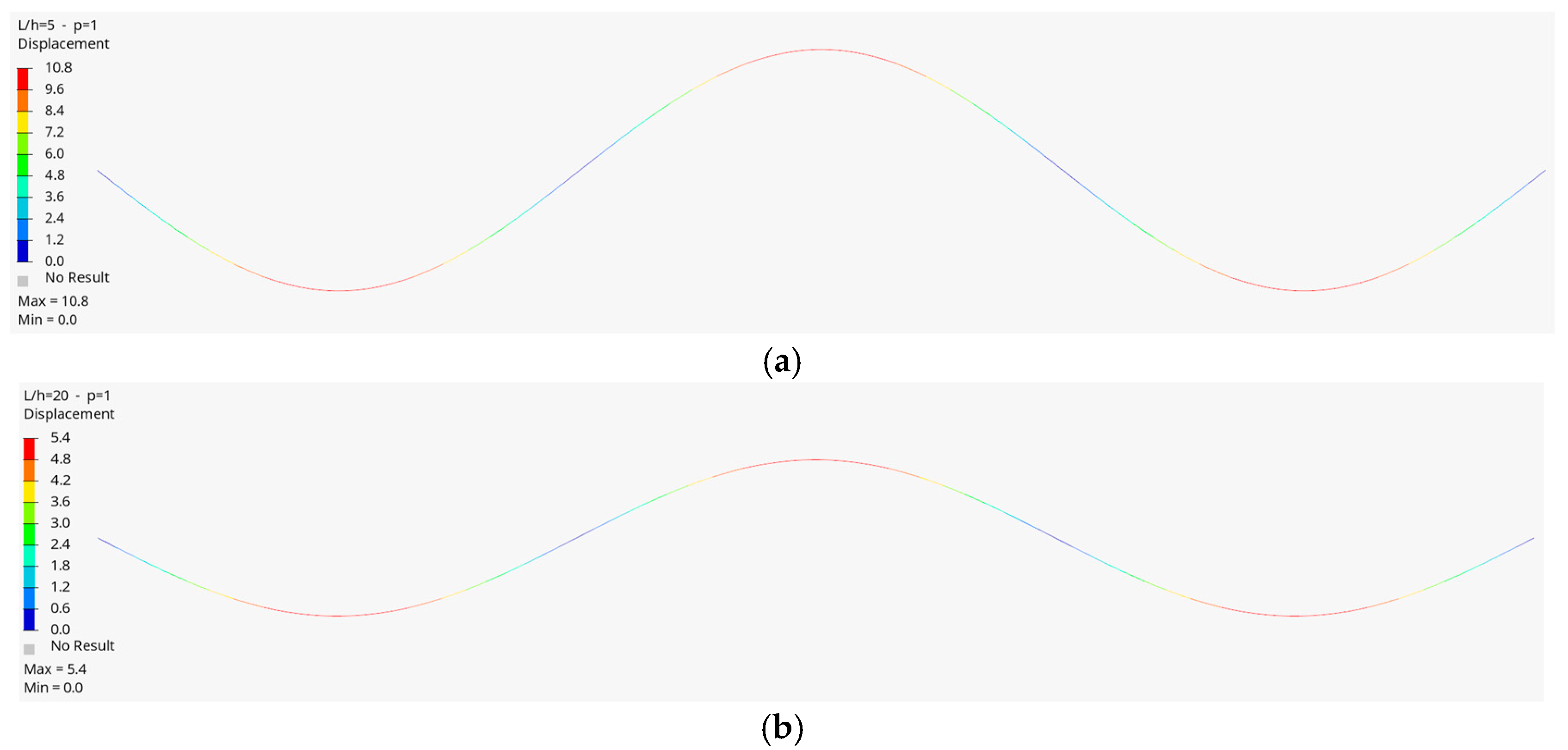 Figure 5. The first mode of the FG beam (a) for the length-to-height ratio (L/h = 5) and p = 1, and (b) for (L/h = 20) and p = 1 (HEX20).