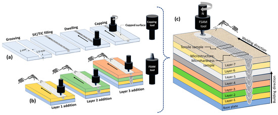 This study aims to address these research gaps by investigating the FSAM of carbide-reinforced Al-7075 multi-layered composites. The mechanical properties, including tensile strength, microhardness, and elongation, are evaluated to assess the influence of SiC and TiC reinforcements. Tool wear is systematically analyzed through dimensional analysis and weight loss assessments to understand the impact of reinforcement on tool degradation. Furthermore, post-welding heat treatment (PWHT) is employed to enhance the microstructural and mechanical performance of the fabricated composites. The primary contribution of this work lies in establishing a comparative understanding of SiC and TiC reinforcements in relation to the microstructure–property relationship and tool wear behavior during the FSAM of Al-7075. This comparative evaluation fills a critical research gap by linking reinforcement selection to process efficiency, tool life, and performance optimization. The findings of this study contribute to the development of lightweight, high-performance structural materials for aerospace and automotive applications.