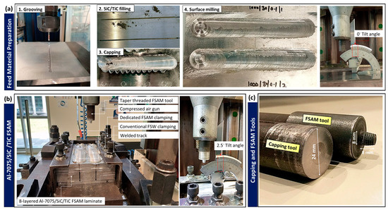 Actual experimental setup: (a) feed material preparation; (b) Al-7075/SiC/TiC composite manufacturing; (c) capping and FSAM tools.