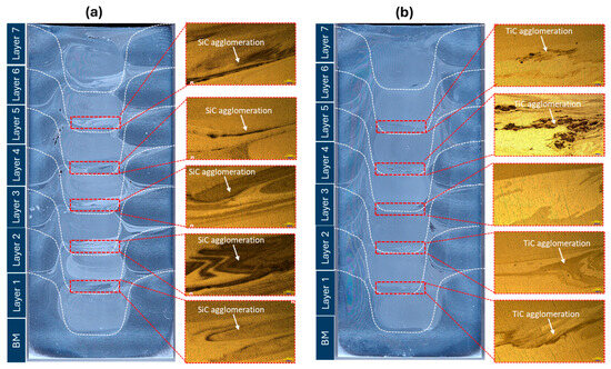 Macrograph of cross-sectioned composites and material mixing at the bottom of layer interfaces: (a) Al-7075/SiC composite; (b) Al-7075/TiC composite.