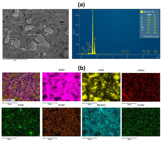 EDX analysis and corresponding elemental mapping of Al-7075/SiC composite at bottom of PDZ: (a) EDX; (b) elemental mapping.