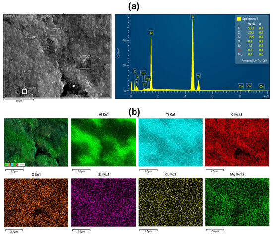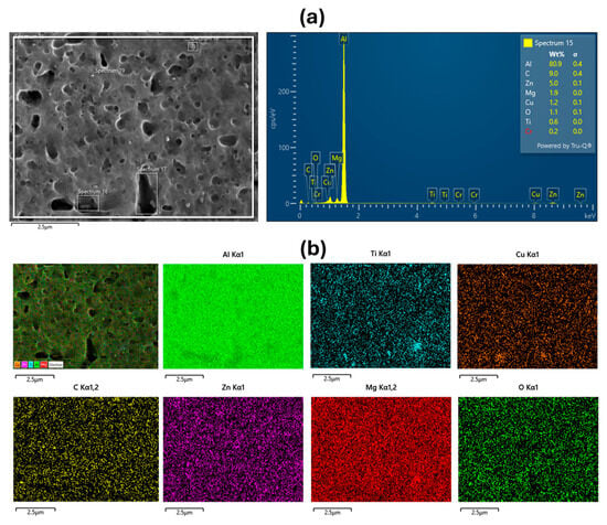 EDX analysis and corresponding elemental mapping of Al-7075/TiC composite at the middle of NZ: (a) EDX analysis; (b) elemental mapping.