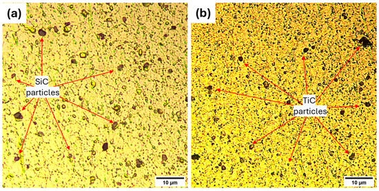 The average microhardness of the SiC-reinforced composite was 88.6 HV, while the TiC-reinforced composite reached 93.7 HV, representing 50.6% and 53.5% of the BM, respectively. These values align with the lower microhardness observed in sample L7, which had no reinforcement [27]. However, the average grain sizes of the SiC and TiC composites were 2.14 µm and 1.25 µm, respectively, showing nearly a 95% reduction compared to the BM as a result of DRX. The microhardness of heat-treatable aluminum alloys such as Al-7075-T6 and Al-6061-T6 is not governed by grain size alone but also depends on the morphology of second-phase strengthening precipitates that significantly influence hardness. The overaging and excessive dissolution of these precipitates leads to a reduction in microhardness. The high TRS of 1000 rpm, combined with a TWS of 20 mm/min, generated excessive heat during processing, leading to material softening and promoting the dissolution and overaging of strengthening precipitates within the aluminum matrix. This heat buildup, along with the limited presence of 5 vol.% reinforcement particles, resulted in a dominant aluminum matrix with reduced microhardness. These processing parameters were chosen to ensure proper dispersion of reinforcement particles and effective bonding with the aluminum matrix. However, the relatively low percentage of reinforcement, combined with excessive softening from the high heat input, contributed to the overall lower microhardness in the as-welded state. A similar reduction in microhardness after the addition of 20 wt.% SiC particles in Al-6061-T6 FSAM composite was reported in a study by S. Choudhury et al. [20]. The loss of microhardness in that study was also attributed to the dissolution of strengthening precipitates of heat-treatable aluminum alloys during the FSAM process [51,52].