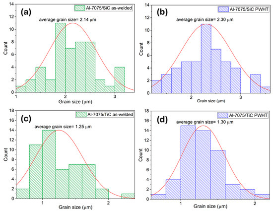 Average grain size distribution within NZ in as-welded and PWHT-treated composites: (a,b) Al-7075/SiC; (c,d) Al-7075/TiC.