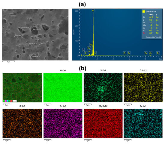 EDX analysis and corresponding elemental mapping of Al-7075/SiC composite at the middle of NZ: (a) EDX analysis; (b) elemental mapping.