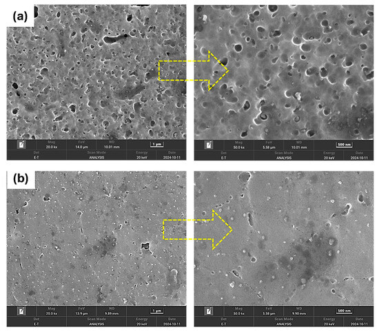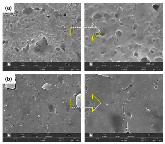 After cyclic solution treatment followed by aging at 130 °C, the precipitates redissolved into the aluminum matrix and subsequently reprecipitated, forming a fine and uniform distribution both inside the grains and along the grain boundaries, as illustrated in Figure 11b and Figure 12b. These precipitates were significantly finer compared to the as-welded state, measuring approximately 53.6 ± 16 nm in the SiC-reinforced composite and 42.65 ± 14 nm in the TiC-reinforced composite, respectively. This refinement contributed to enhanced mechanical properties.