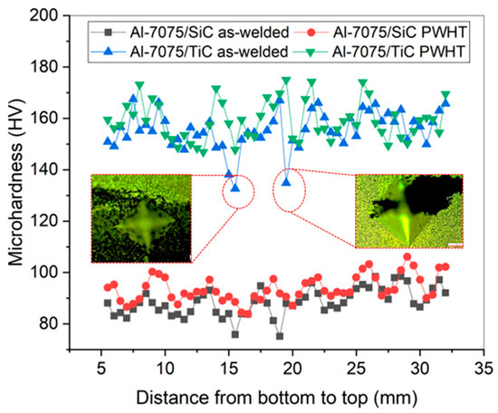 Microhardness profiles of both Al-7075/SiC- and Al-7075/TiC-reinforced composites, before and after PWHT, are shown in Figure 13. Continuous forced cooling during processing effectively controlled static annealing and contributed to uniform microhardness across the fabricated composites by maintaining lower peak temperatures and reducing thermal exposure time. In contrast, previous studies [13,14,15,16,20,21,23] that employed natural cooling at room temperature reported a linear increase in microhardness from the bottom to the topmost layer due to repeated exposure to elevated temperatures during successive passes. However, localized reductions in microhardness were observed in certain PDZ regions, primarily due to the agglomeration of SiC and TiC particles. Such agglomeration led to inadequate bonding with the aluminum matrix, resulting in porosity and interparticle gaps at the microscale [46], which caused incomplete impressions from the microhardness indenter, as shown in Figure 13.