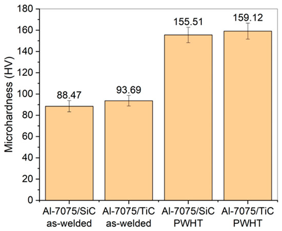 After PWHT, the microhardness of both composites increased notably, reaching 155.5 HV for the SiC composite and 159 HV for the TiC composite, as shown in Figure 14. These values are close to the BM microhardness (175 HV). The improvement is attributed to the reprecipitation and uniform dispersion of aluminum-strengthening precipitates that had coarsened during FSAM. This refined and homogeneous distribution of precipitates after PWHT can be seen in Figure 11 and Figure 12, which demonstrates microstructural recovery within the aluminum matrix and contributes to enhanced overall hardness. The TiC-reinforced composite exhibited a higher hardness of 159 HV, exceeding the values (90–130 HV) reported for Al-7075/ZrO2/Gr, Al-7075/Al2O3, and Al-7075/TiC composites fabricated through FSAM and AFSD [23,24,53,54].