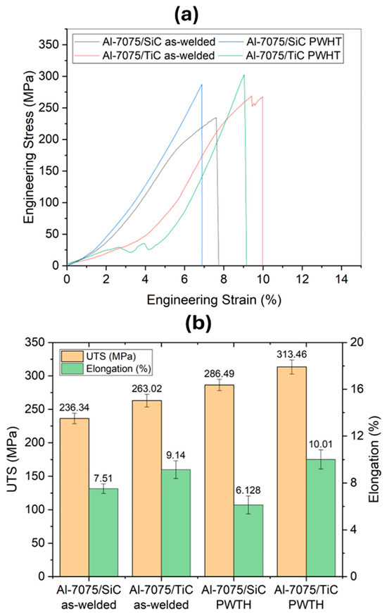PWHT partially recovered strength by reprecipitating and stabilizing the strengthening phases in the aluminum matrix. Nevertheless, reinforcement agglomeration persisted, leading to premature fracture. Additionally, AGG observed after PWHT (Figure 8) further limited strength improvement. The average UTS increased from 236.34 MPa (SiC) and 263.2 MPa (TiC) in the as-welded condition to 286.49 MPa and 313.46 MPa, respectively, after PWHT, as shown in Figure 15. Overall, the TiC-reinforced composite achieved 56% of the BM UTS, while the SiC-reinforced composite attained 51.15%. A similar reduction in strength after the addition of 20 wt.% SiC particles in the Al-6061-T6 FSAM composite was reported in a study by S. Choudhury et al. [10,20], where the material exhibited excellent bonding and even dispersion. Interestingly, no significant improvement in UTS was observed compared to the Al-6061-T6 composite fabricated without SiC reinforcement. In contrast, the tensile strength results of the present study exceeded the values (250–280 MPa) reported for Al-7075/ZrO2/Gr and Al-7075/TiC composites fabricated through FSAM and AFSD [23,24,54].