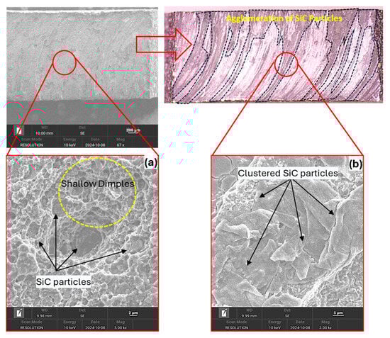 In the SiC composite (Figure 16), the fracture surface reveals widespread clusters of SiC particles appearing as dark grey regions, indicating poor interfacial bonding with the aluminum matrix. Only a few isolated light grey regions exhibit better bonding. SEM magnification confirms that clustered SiC regions weaken the matrix–particle interface, promoting crack initiation and premature failure. Conversely, the limited well-bonded regions display shallow dimples (Figure 16a), reflecting localized plastic deformation that accounts for the measured elongation of 7.5%. However, due to the dominance of poorly bonded clusters, the composite exhibits early fracture and low ductility.