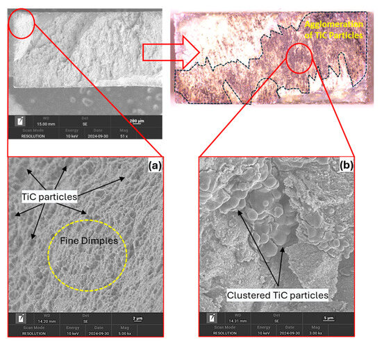 In contrast, the TiC-reinforced sample (Figure 17) exhibits a fracture surface where approximately 60% of the gauge area is clustered with TiC particles, which appear as dark regions, while the remaining 40% of the gauge area, represented by light grey regions, indicates better bonding between TiC particles and the aluminum matrix. Magnified images reveal that the regions with better TiC-Al matrix bonding (light grey) exhibit fine dimples on the fracture surface (Figure 17a). These regions also show smaller TiC particles, indicating effective bonding and ductile fracture behavior. In contrast, regions where TiC particles are clustered (Figure 17b) show poor bonding, leading to stress concentration zones that contribute to premature failure.