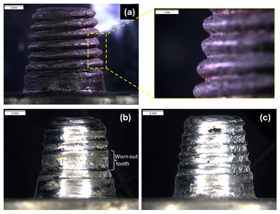Macrographs of tool pins: (a) actual tool before FSAM; (b) tool after 8-layered SiC-reinforced composite fabrication; (c) tool after 8-layered TiC-reinforced composite fabrication.