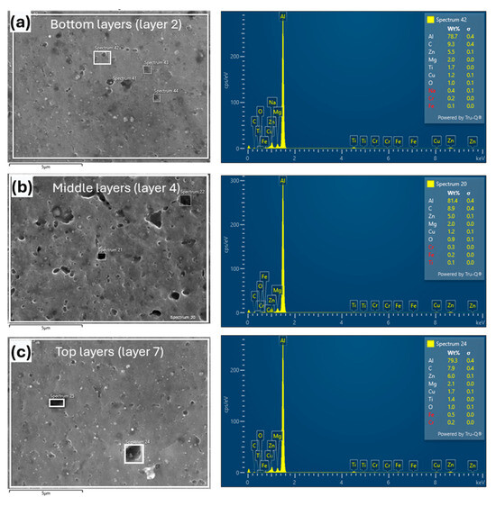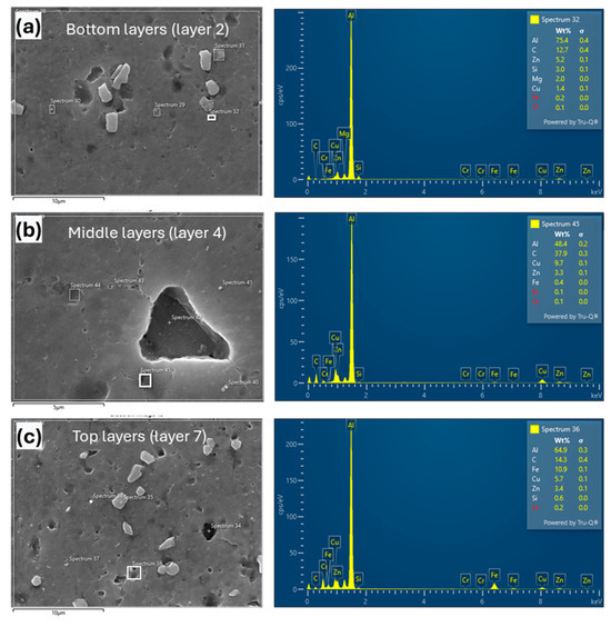 Furthermore, to validate the dimensional analysis, EDX was performed on the bottom, middle, and top regions of the SiC-reinforced composite. The EDX data for spot 32 (bottom), spot 45 (middle), and spot 36 (top), as shown in Figure 19, confirm the presence of iron (Fe), indicating tool wear throughout the process. At the bottom (spot 32), Fe content was 0.2%, which increased to 0.4% in the middle (spot 45) and reached 10.9% at the top (spot 36). Initially, with a fresh tool, the wear rate was minimal, resulting in low Fe content in the bottom layers. However, significantly higher Fe content in the top layers reflects increased tool degradation due to continuous interaction with SiC particles, exacerbating tool wear [20]. Ultimately, one complete thread of the tool pin, as shown in Figure 18, was worn out, and the tool experienced a weight loss of 1.17% by the end of the eight-layered SiC-reinforced composite’s fabrication.