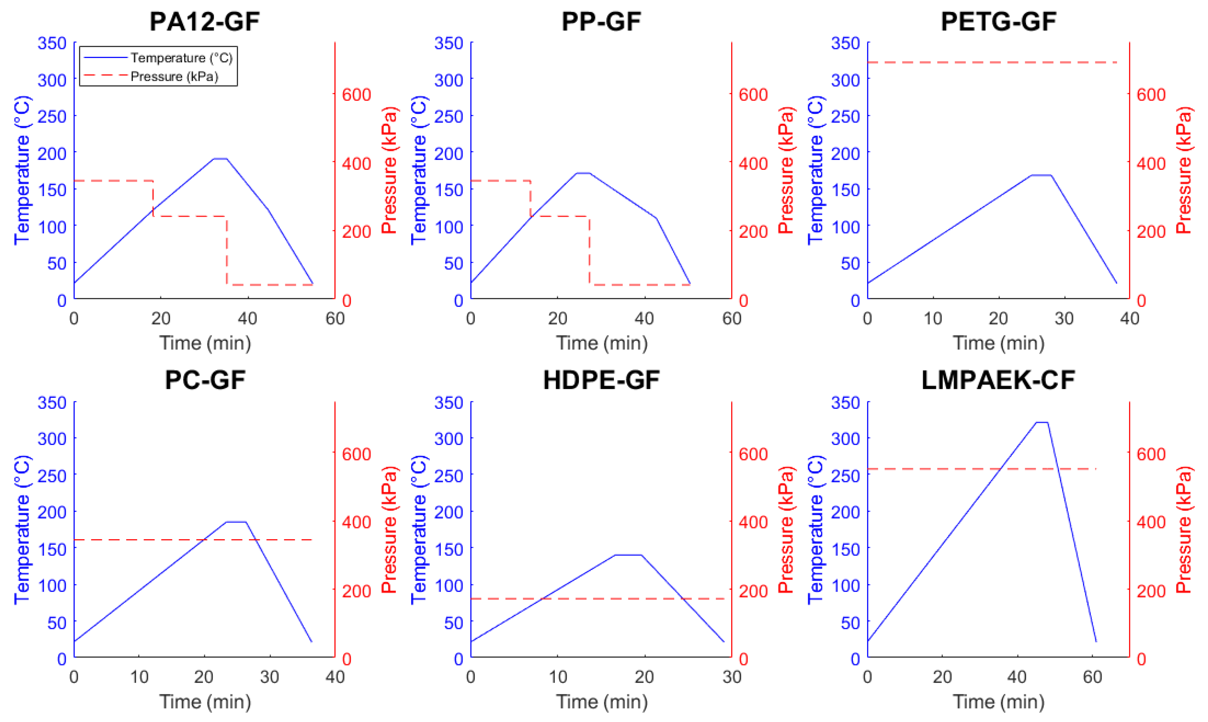 - Kravtsova, V.; Minchenkov, K.; Gusev, S.; Evlashin, S.; Bondareva, J.; Alajarmeh, O.; Safonov, A. Recyclability of unidirectional reinforced pultruded thermoplastic profiles in composite laminates. Compos. Commun. 2024, 46, 101843. [Google Scholar] [CrossRef]