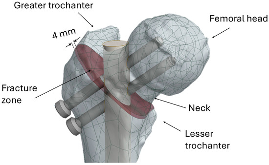 Three-dimensional geometric modeling was initially performed using Autodesk Inventor 2024 (Autodesk Inc., San Francisco, CA, USA) and then exported for processing in the finite element analysis environment. The femur geometry was obtained from the Sawbones database (https://sawbones.com/), while the intramedullary nail was modeled according to technical data available in the literature. The 3D model was processed in Mimics 19.0 software, where an intertrochanteric fracture of type 31-A2, according to the AO/OTA classification, was reproduced (Figure 1). To simulate the displacement of the head–neck segment, a 4 mm gap was introduced [45].
