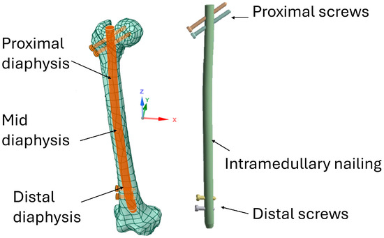 Subsequently, the nail was designed using the CAD software Autodesk Inventor and positioned within the intramedullary canal in accordance with surgical protocols [45,46] (Figure 2).