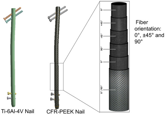 Two materials were analyzed for the nail: a titanium alloy (Ti-6Al-4V) and CFR-PEEK (see Figure 3). For the CFR-PEEK nail, the fiber arrangement was defined according to the recommendations of Samiezadeh et al. [47]. Laminates composed of 10–20 plies with angular orientations of 0°, ±45° and 90° were considered to achieve an orthotropic and balanced configuration. This arrangement was found to be advantageous as it enables the intramedullary implant to achieve adequate axial flexibility whilst maintaining sufficient stiffness in bending and torsion. This ensures greater fracture stability and promotes the bone healing process. For sizing, adult femoral nails commonly use nominal outer diameters in the 9–12 mm range (cannulated designs), and structural CFR-PEEK laminates typically employ a fiber volume fraction of approximately 55–65%. Where needed for FEA, the longitudinal direction was aligned with the nail axis, and transverse/isotropic resin properties were assigned to the matrix-dominated directions.