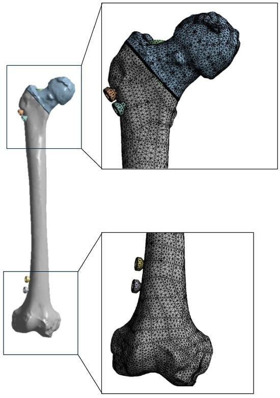 Boundary conditions included nonlinear frictionless contact between the intramedullary nail and the endosteal canal; bonded contact at screw–bone interfaces; and a fully constrained distal femur (Figure 5). All contacts were implemented as surface-to-surface using the Augmented Lagrange formulation with program-controlled normal stiffness; separation was permitted at frictionless interfaces. Simulations were performed under quasi-static conditions with geometric/contact nonlinearity and automatic substepping.