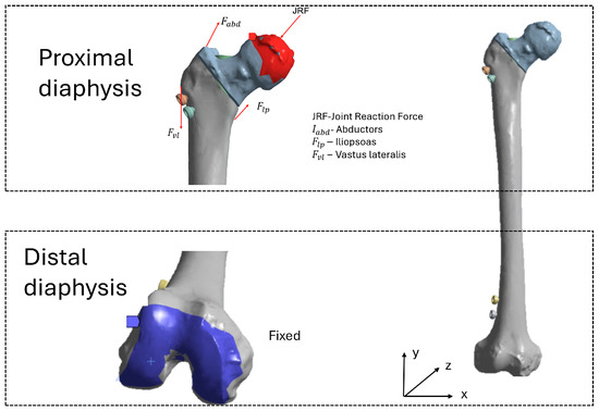 The loading conditions applied to the finite element (FE) models of the femoral neck were carefully defined to simulate the mid-stance phase of gait under single-limb support [61]. Muscle forces were considered, including the three main groups of muscles: the abductors, the vastus lateralis and the iliopsoas, as well as the hip joint contact force. These muscle forces were modulated according to age, with a 40% reduction assumed for elderly subjects compared to younger ones. This is consistent with the loss of muscle mass and strength associated with aging [61,62,63].