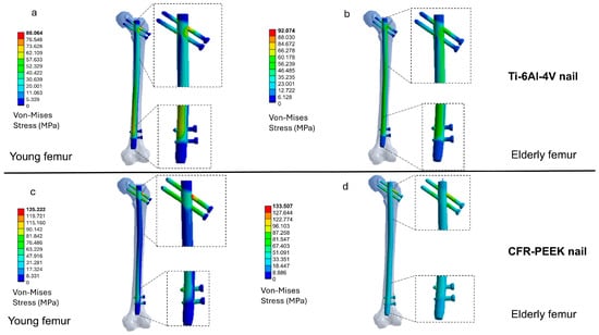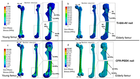 Von Mises stress distribution in the femur for young and elderly patients, comparing Ti-6Al-4V and CFR-PEEK intramedullary nails: (a) young femur with Ti-6Al-4V nail, (b) elderly femur with Ti-6Al-4V nail, (c) young femur with CFR-PEEK nail, and (d) elderly femur with CFR-PEEK nail.