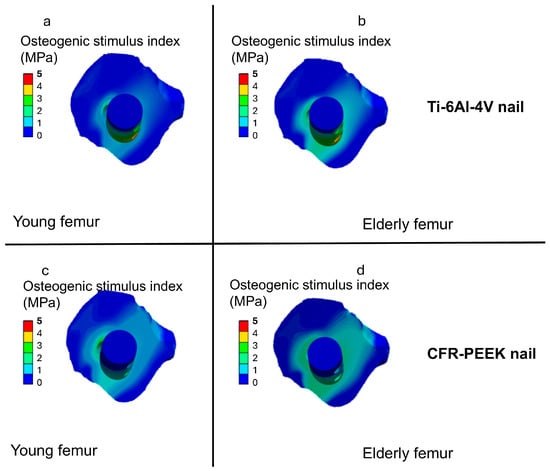 Figure 8 presents a top (axial) sectional view of the proximal femur–nail assembly, centered on the proximal locking holes and screws and oriented along the femoral axis to depict load transfer and stress distribution in the most critical region for construct stability and fracture healing. Within this fracture section, the osteogenic index (OI) shows clear differences between materials and age groups, consistent with Carter’s thresholds [65].