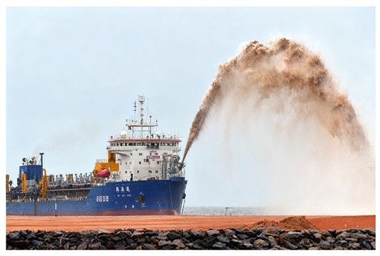 Calcareous sand is a sediment formed through a series of intricate physical, biological, and chemical reactions involving the remains of marine organisms; Its primary component is calcium carbonate [1]. In contemporary marine engineering construction, calcareous sand plays a crucial role as a vital material in the development of civil engineering infrastructure, particularly in the construction of reefs and islands [2,3,4,5,6] (Figure 1).