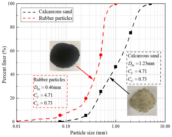 The test calcareous sand was taken from the South China Sea. It was an uncemented loose body of particles with extremely irregular surfaces, different sizes, white color, rich internal pores, and different particle shapes such as sheets, spindles, and branches. The rubber fiber was black granular debris obtained by mechanical crushing. The test parameters of the two materials are shown in Table 1, and the particle grading curves obtained after the particle analysis test are shown in Figure 3.