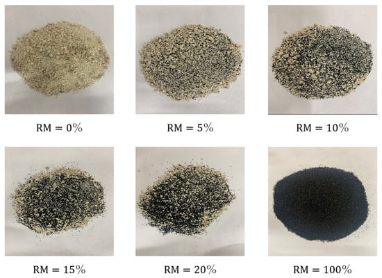 The rubber-modified calcareous sand samples for different RMs are shown in Figure 4. The maximum, minimum, and Dr = 70% dry densities of the samples for different RM values are provided in Table 2. The variation in the dry density of the sample with increasing RM is shown in Figure 5. The dry densities of the samples in different states gradually decreased with increasing RM, which showed a nearly linear trend. To prevent uncertainty in the experimental results caused by the salt and binders on the surface of the calcareous sand, the samples were cleaned until the filtrate was transparent and the suspended matter is not obvious and then dried before testing began.