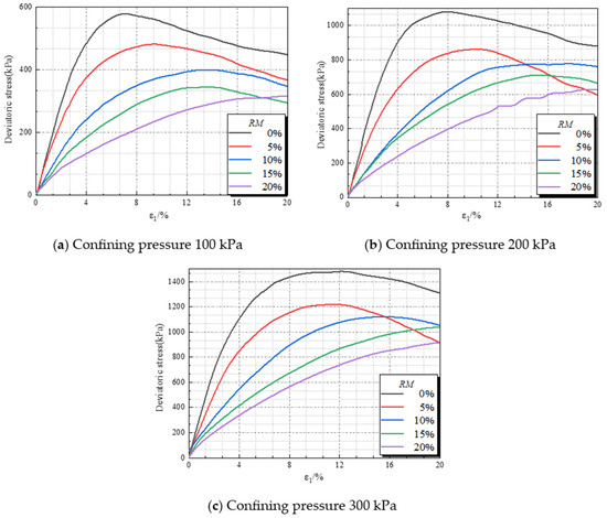 After processing the CD test data of the rubber-modified calcareous sand with different RMs, the deviatoric stress–axial strain curves for different confining pressures were obtained as shown in Figure 7. At the same confining pressure, the initial modulus of the stress–strain curve of each sample decreased with increasing RM, and the curve showed the more obvious characteristics of hardening. The peak stress achieved by the sample decreased with increasing RM, and the axial strain corresponding to the peak stress increased with increasing RM. After the toughness of the low RM sample is weak and reaches the maximum strength, the deviatoric stress decreases rapidly with the increase in strain. For the sample with more than 10% RM, the toughness is obviously enhanced, and the decrease rate of the deviatoric stress becomes slower. The trends were similar to those obtained by Anvari et al. [43] in CD tests of mixtures of rubber particles with quartz sand at different mix ratios.