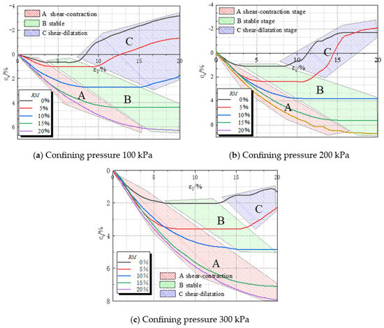 The characteristics of the volume strain–axial strain of rubber-modified calcareous sand samples with different RMs at different confining pressures are shown in Figure 8, where A represents the shear-contraction stage, B is the stable stage (with the increase in axial strain, the volume of the sample almost does not change), and C is the shear-dilatation stage.