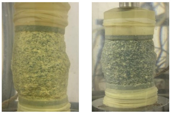 Calcareous sand was incompressible and undeformed, but, under high pressure, the extrusion between the particles caused the initially angular particles to be broken into multiple fragments; the particles to become rounder, and the rubber particles had small moduli and a strong ability to undergo deformation (mainly elastic deformation) [44]. Therefore, the shear characteristics of the rubber-modified calcareous sand were closely related to its RM. When the sample had a small RM, the force transmission mechanism under the action of external force was mainly the rigid contact between the particles of calcareous sand, and the shear compression characteristics of the sample were similar to those of unmodified calcareous sand. Before compression, the rubber-modified calcareous sand was very porous and in a loose state. When the axial stress was applied, the pores between the particles decreased rapidly, and the fine particles produced by particle grinding filled the pores of the large particles, making the sample more compact. The stress–strain curve of the sample showed a trend of approximate linear change with continuously increasing stress, and the volume of the sample decreased, which was characteristic of shear contraction. As the stress increased further, some large particles appeared to have become more spherical, which led to a dislocation movement between particles, and the interlocking friction between particles decreased. The rising slope of the stress–strain curve decreased rapidly, the axial strain of the sample continued to increase, the volume of the sample was no longer reduced, and the stress–strain curve of the sample showed characteristics of softening. When the axial stress increased to a certain value, the sample was completely destroyed, and the sample underwent shear dilatation and produced an inclined shear band, and the stress–strain curve showed a downward trend. When the sample had a high RM value, the force transmission mechanism of rubber-modified calcareous sand under the action of external force included rigid contacts between calcareous sand particles, nonrigid contacts between calcareous sand, and rubber and nonrigid contacts between rubber particles; As the sample RM increases, the proportion of the latter two non-rigid contact modes gradually increased. Due to the elastic deformation of the rubber fibers, the smoothing and breakage of calcareous sand particles caused by the stress concentration were inhibited. Additionally, the dislocations between particles were buffered. As a result, the deformability of the specimen was enhanced, and the stiffness of the specimen was reduced. As shown in Figure 9, it was difficult for a shear band to form, and the hardening features of the stress and strain curves of the sample were more obvious. At the same time, during the shear compression process, due to the increase in stress, the rubber fibers were tightly compressed, and they deformed and fully filled the pores of the calcareous sand particles, resulting in a reduction in the pore ratio of the sample. Thus, samples with large RM values exhibited monotonic shear contraction characteristics.