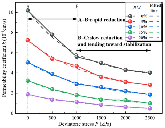 The permeability coefficient–deviatoric stress curves of rubber-modified calcareous sand with different RMs are shown in Figure 10. Figure 10 shows that, with increasing deviatoric stress, the permeability coefficients of the samples with different RMs decreased, and the rate of decrease gradually decreased with increasing deviatoric stress. Each curve could be divided into two stages: rapid reduction (A–B), and the slow decrease and tendency toward stabilization (B–C); 1000 kPa was the boundary between the two stages. In stage A–B, there were multiple pores, calcareous sand particles with irregular shapes, and pores that were extremely sensitive to the change in load. Thus, the pores of rubber-modified calcareous sand were rapidly compressed and reduced by loading, and the water flow was blocked, resulting in a significant decrease in the permeability coefficient in this stage. In the B–C stage, with the increase in deviatoric stress, close contact developed between the particles of the rubber-modified calcareous sand. The particles of calcareous sand did not easily deform. When the original pore structure decreased under deviatoric stress, further compression was difficult. The sample pores were reduced by particle fracture, but the breakage amplitude of the particles was limited. Thus, the slope of the B–C stage of the curve slowly decreased.