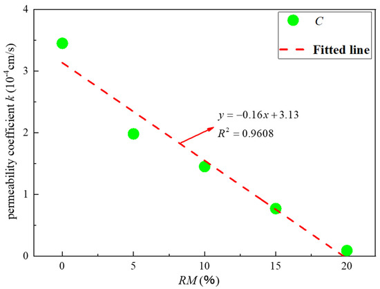 When p tended to infinity, the permeability coefficient k in Equation (6) was . There was a good linear relationship between C and RM, and the fitting formula was as follows:
